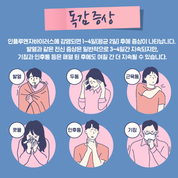 감염 후 1~3일 정도의 잠복기간을 거쳐 복수의 증상이 수시간 단위의 매우 짧은 기간에 급격히 발병. 감기 는 발증 후 경과가 완만하고 재채기와 목의 통증, 콧물 , 코 막힘 등이 주된 증상인 반면, 인플루엔자는 발열(38℃ 이상이 되기 쉽다)을 비롯해 두통, 목의 통증, 관절・근육의 통증, 기침, 콧물, 전신의 처짐 등 전신에 증상이 급격하게 나타나는 것이 특징. 아이나 고령자, 임산부, 또 면역력이 약하고 있는 사람이 감염하면, 폐렴이나, 인플루엔자 뇌증, ARDS(급성 호흡 곤란 증후군.폐포에서의 가스 교환이 잘 실시할 수 없고, 가파른 호흡 곤란 이나 호흡 곤란 등 가 출현하는 병태), 급성 심막염, 심근염 등의 질병으로 발전하는 등 중증화하기 쉽다.
