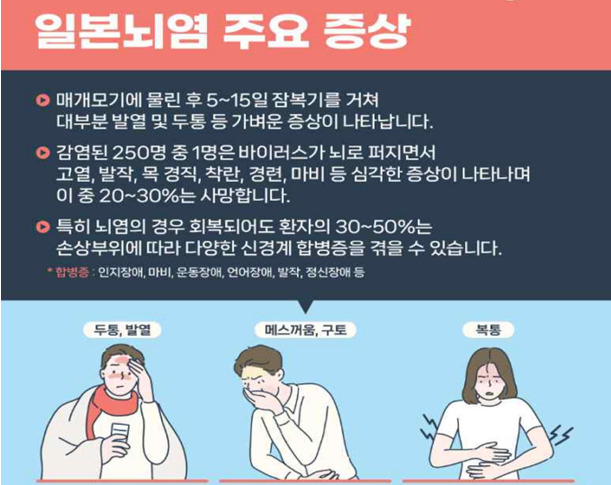 일본 뇌염 바이러스에 감염된 모기(코가타아카이에카)에 찔리는 것으로 우울한 감염증. 모기에 물린 후 6~16일 후에 발병한다. 인간으로부터 인간에게 감염되는 것은 아니지만, 모기의 활동이 활발해지는 여름에는 주의가 필요하다. 일본 뇌염 바이러스는 돼지 등 동물의 체내에서 증식하여 한 개체를 찌른 모기가 다른 개체를 찌르는 것으로 광범위하게 퍼져 나간다. 이 바이러스는 감염해도 대부분의 경우 증상이 없고, 눈치 채지 않는 정도로 끝나지만, 100~1000명에 1명 정도의 비율로 뇌염을 발병한다. 발병했을 경우 약 20~40%의 감염자가 죽음에 이르고 일명을 잡아도 많은 경우 뇌 등에 후유장애를 남긴다.