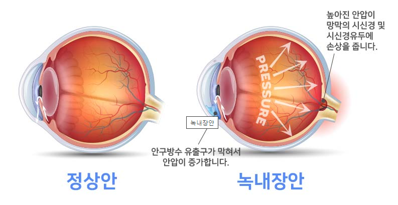 안구 내에서는 항상 방수라고 불리는 물이 만들어져 있고, 그 수압을 안압이라고 부른다. 방수가 만들어지면 안압이 올라가지만, 통상은 같은 양의 방수가 뿔각 섬유주대라고 불리는 눈의 기관으로부터 흘러 나가는 것으로, 안압이 일정하게 유지되고 있다. 이 균형이 어떤 요인에 의해 무너져 안압이 너무 올라가고, 그 압력으로 시신경이 손상되어 버리는 것이 녹내장이다. 또한 안압이 정상 범위이면서 발병하는 타입의 녹내장도 존재하며, 이것은 정상 안압 녹내장이라고 불린다. 정상 안압 녹내장은 시신경의 안압에 대한 저항력이 약하고, 보통은 녹내장을 발병하지 않는 수준의 안압에서도 시신경이 손상되어 버리는 것이 원인이라고 생각되고 있다.