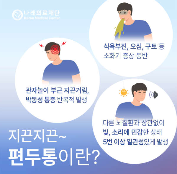 코메카미로부터 눈의 둘레가, 즈키즈키와 심장의 움직임에 맞추는 리듬으로 아프는 것이 특징. 메스꺼움과 구토를 수반하여 빛, 소리, 기압과 온도 변화에 민감해지는 경우도 많다. 개인차가 있지만, 1개월에 1~2도, 많은 사람이라면 1주일에 1번 등의 페이스로 주기적으로 통증이 일어나, 몸을 움직임으로써 통증이 증가하기 때문에, 일상생활에 지장을 온다 일도 있다. 원인은 분명히 해명되지 않았지만, 뇌의 혈관을 둘러싼 삼차 신경의 염증이 관여하고 있다고 생각되고 있다. 20대~40대 여성에게 많고, 생리 전부터 생리중에 걸쳐 두통이 일어나기 쉽기 때문에, 여성 호르몬과의 관계성도 의심되고 있지만, 남성에게도 일어난다.