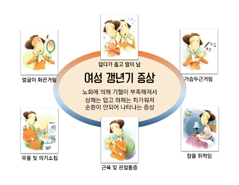 사람에 따라 증상은 다양합니다. 갱년기의 증상은 에스트로겐의 감소뿐만 아니라 심리적인 요인이나 사회적·환경적인 요인 등도 복잡하게 관여하기 때문에 전신에 다양한 증상이 나온다. 주된 증상으로서 자율신경의 혼란으로부터 일어나는 동계나 호흡 곤란, 흐림, 홍조, 발한 이상 등 외, 두통이나 요통, 어깨 응축, 사지의 저림, 좌절감, 현기증, 이명, 불안감, 불면 , 식욕 부진 등이 보인다. 또한, 피부나 점막의 건조, 드라이 마우스 , 요실금 , 외음부의 가려움 등도 생긴다.