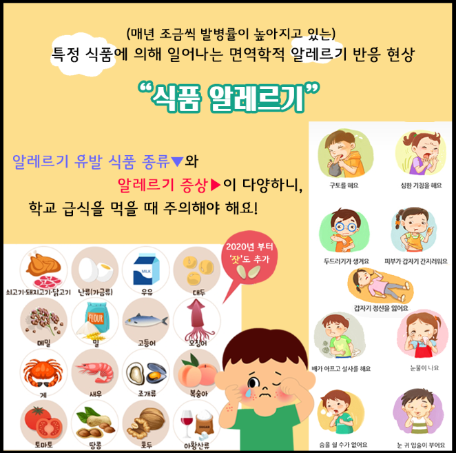 알레르기란 몸에 들어온 이물질을 배제하는 "면역"의 구조가 과민하게 작용해 버리는 현상을 말합니다. 음식 알레르기는 특정 음식으로 인해이 알레르기가 일어나는 질병입니다. 특히 어린이에게 많은 질병으로 유아의 5~10%, 학동기의 1~3%가 음식 알레르기로 여겨지고 있습니다. 그러나 주요 원인 음식인 계란·우유·밀은 나이가 오르면 알레르기가 일어나지 않는 것으로 알려져 있습니다. 그러나, 사람에 따라서는 아나필락시스 쇼크 라고 불리는, 생명을 위협하는 것과 같은 전신성의 매우 강한 증상이 나오는 경우도 있습니다. 음식 알레르기 증상을 의심했을 때는 신속하게 의료 기관을 진찰하고 원인이되는 음식을 조사하는 것이 중요합니다.